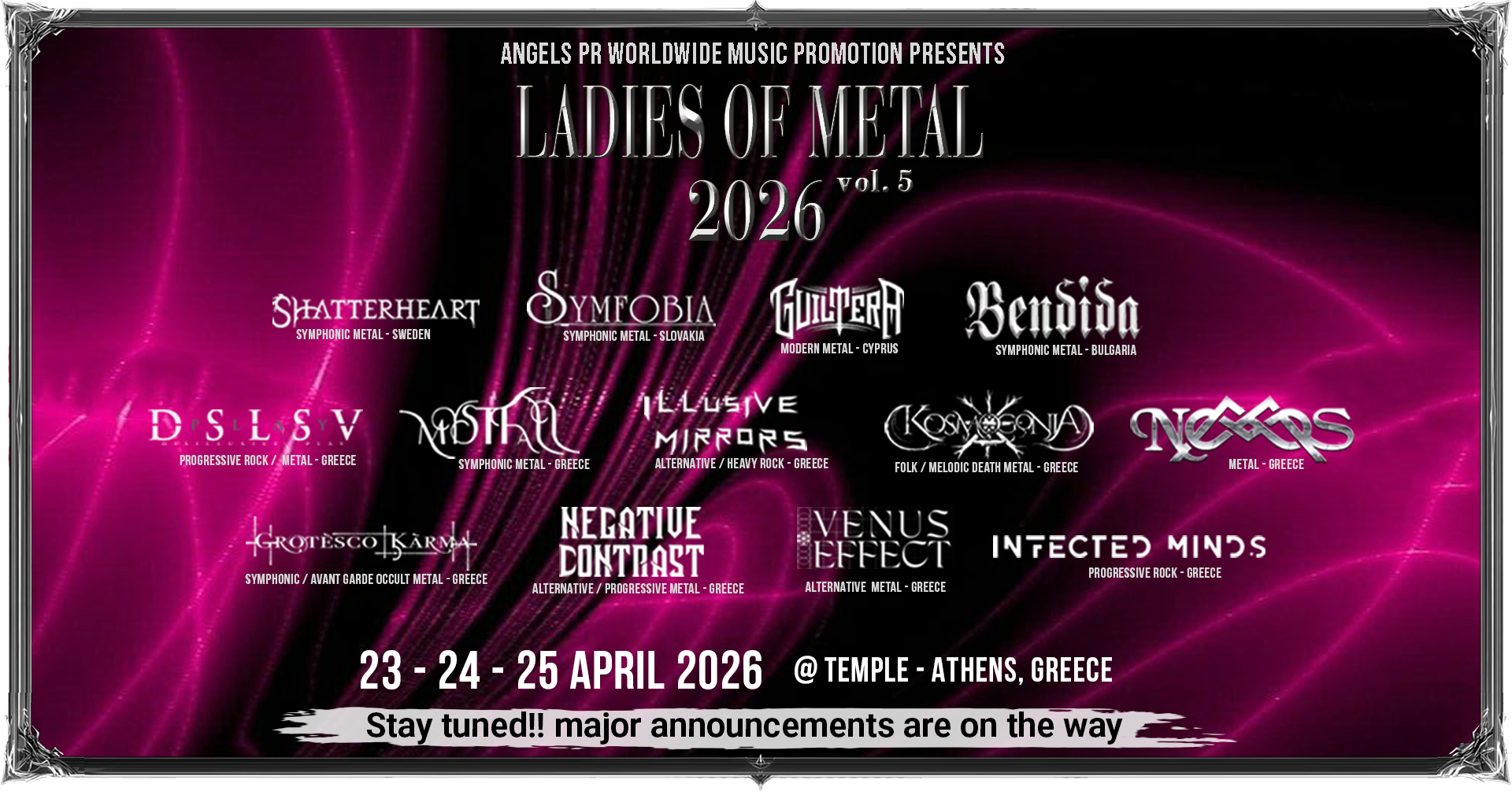 Το Ladies of Metal Festival επιστρέφει το 2026 πιο εκρηκτικό, πιο φιλόδοξο και πιο δυναμικό από ποτέ! Η Angels PR Worldwide Music Promotion ανακοινώνει με υπερηφάνεια την πέμπτη διοργάνωση του εμβληματικού female‑fronted metal festival, το οποίο για ακόμη μία χρονιά θα φιλοξενήσει μερικά από τα