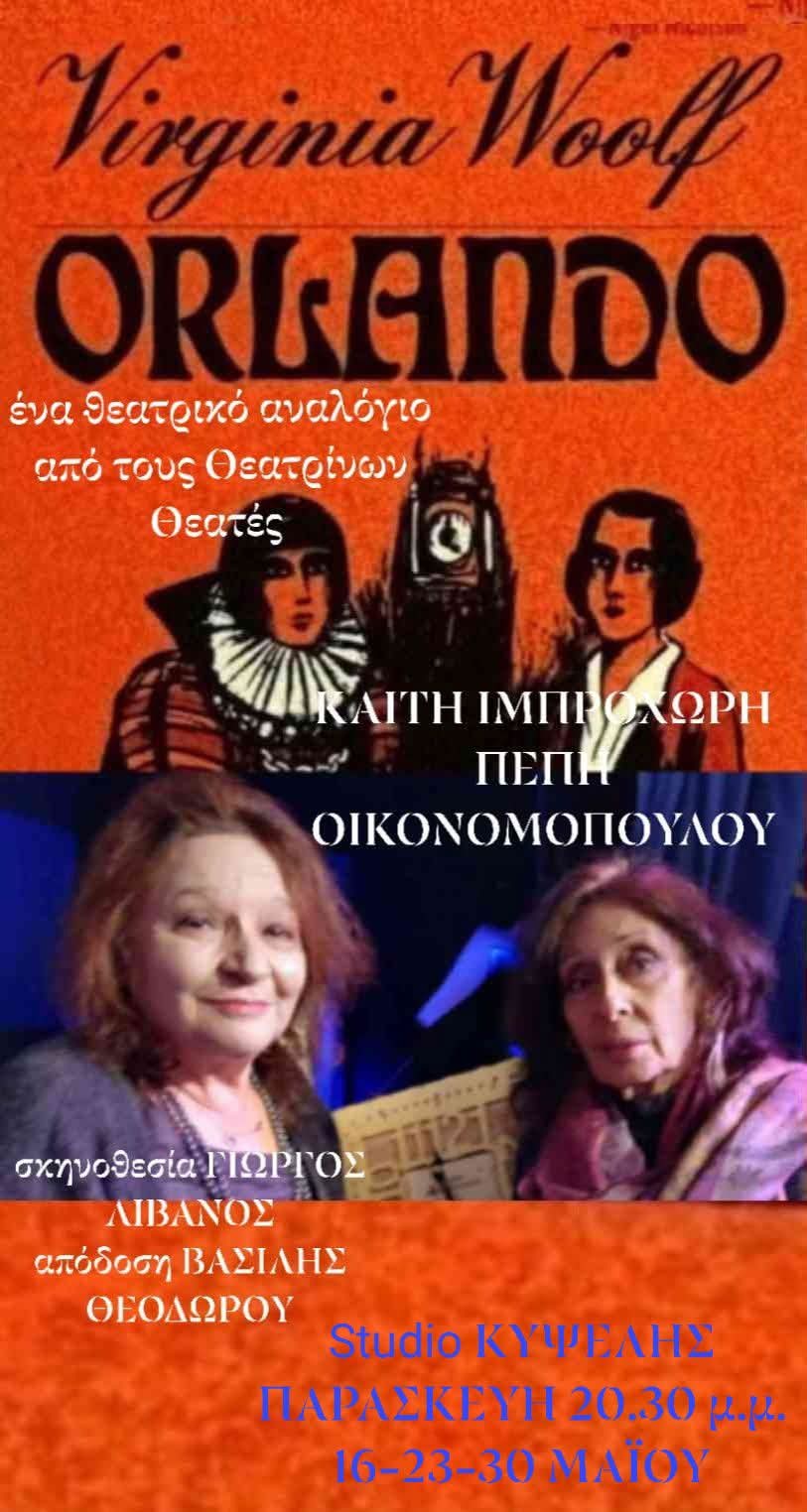 3 ΕΞΤΡΑ ΠΑΡΑΣΤΑΣΕΙΣ ΛΟΓΩ ΕΠΙΤΥΧΙΑΣ & με ΕΟΡΤΑΣΤΙΚΌ ΧΑΡΑΚΤΗΡΑ Οι ΘΕΑΤΡΙΝΩΝ ΘΕΑΤΕΣ πιστοί στο ανοιξιάτικο ραντεβού θεατρικού αναλογίου, που έχει καθιερωθεί στο STUDIO ΚΥΨΕΛΗΣ, φέτος ενώνουν 2 κυρίες της ελληνικής θεατρικής σκηνής που συναντούν το περίφημο ΟΡΛΑΝΤΟ της ΒΙΡΤΖΙΝΙΑ ΓΟΥΛΦ. Την