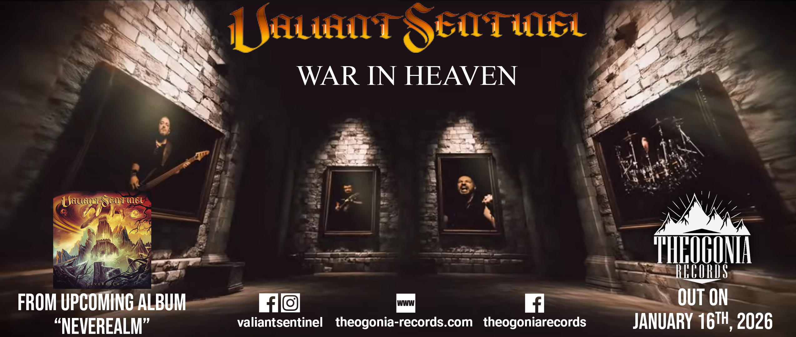 VALIANT SENTINEL - "War In Heaven" (Official Video) (Δείτε το εδώ) https://www.youtube.com/watch?v=Z8sR_Pe0ivM Η Theogonia Records με υπερηφάνεια ανακοινώνει τη συνεργασία της με την ανερχόμενη δύναμη του power metal, Valiant Sentinel, για την κυκλοφορία του πολυαναμενόμενου δεύτερου άλμπουμ τους, "Neverealm", που πρόκειται να κυκλοφορήσει